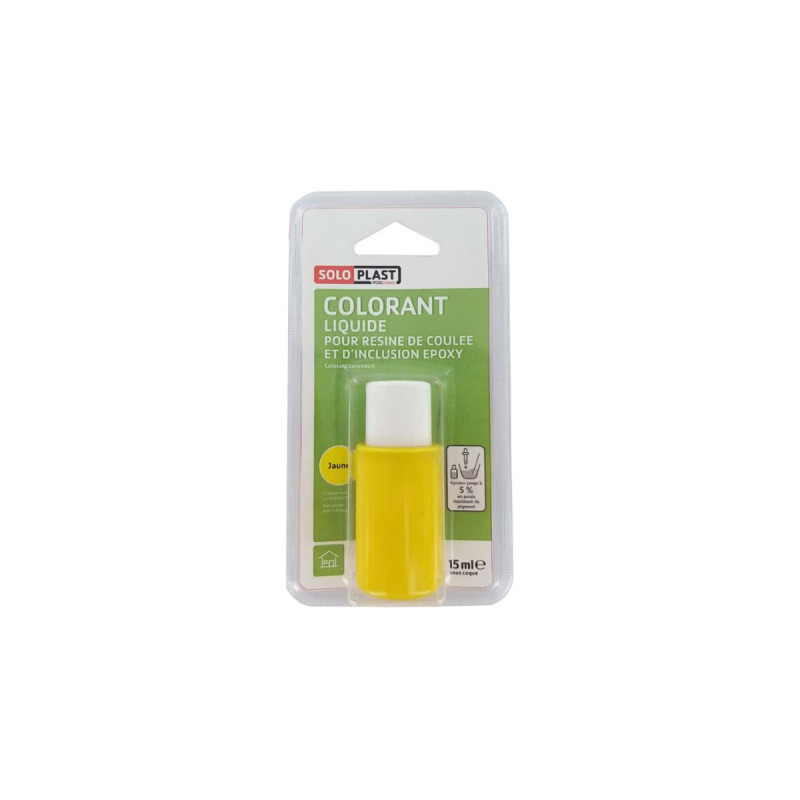Liquide colorant pour résine SOLOPLAST 15ml jaune, colorant en liquide d'une couleur jaune se mélangeant à de la résine de coulée et d'inclusion époxy. Ajouter 5% en poids maximum de colorant à votre résine afin d'obtenir le meilleur résultat.