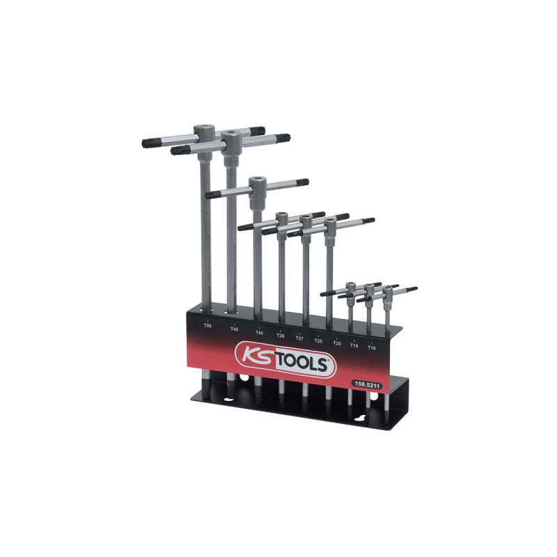 Jeu de clés KS TOOLS - Poignées en T - Sur présentoir métalliques - 9 pcs, Jeu de clés mâles à tête torx à poignées en T, en chrome vanadium. Possède 3 positions d'arrêt. Jeu sur présentoir.
