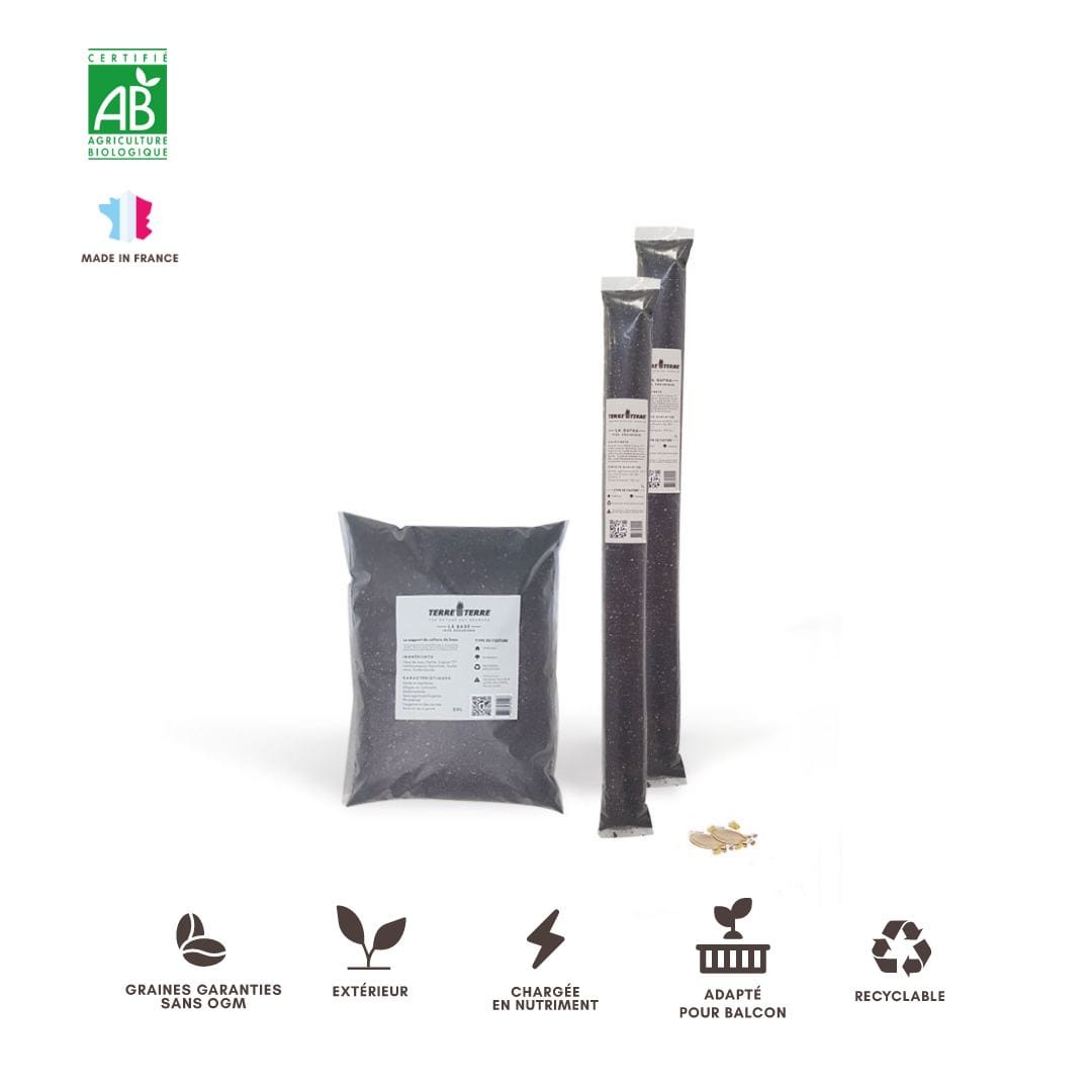 Deux produits phares sont proposés : La Base, utilisable en intérieur et en extérieur, pour aérer la terre et favoriser la croissance racinaire. La Supra qui est un terreau bio enrichi, utilisable aussi bien en intérieur qu’en extérieur et chargé en nutriments pour maximiser la production. Nous avons également créé pour vous des kits regroupant plusieurs produits TerreTerre qui répondront parfaitement à vos attentes : le kit citadin permet aux personnes vivant en ville d’avoir une terre riche dans leur petit potager, jardinet et même pour les balcons, tandis que le kit démarrage permet aux débutants de se lancer.
